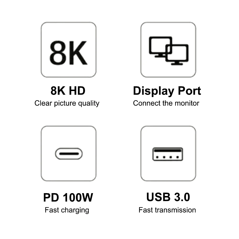 3. 8K Video USB-C to DP Adapter: Use the DP port of the USB C hub to mirror or extend the screen, and directly transmit 4K UHD video to HDTV, display machine or projector at 8K 60 Hz or Full HD 4k60.
