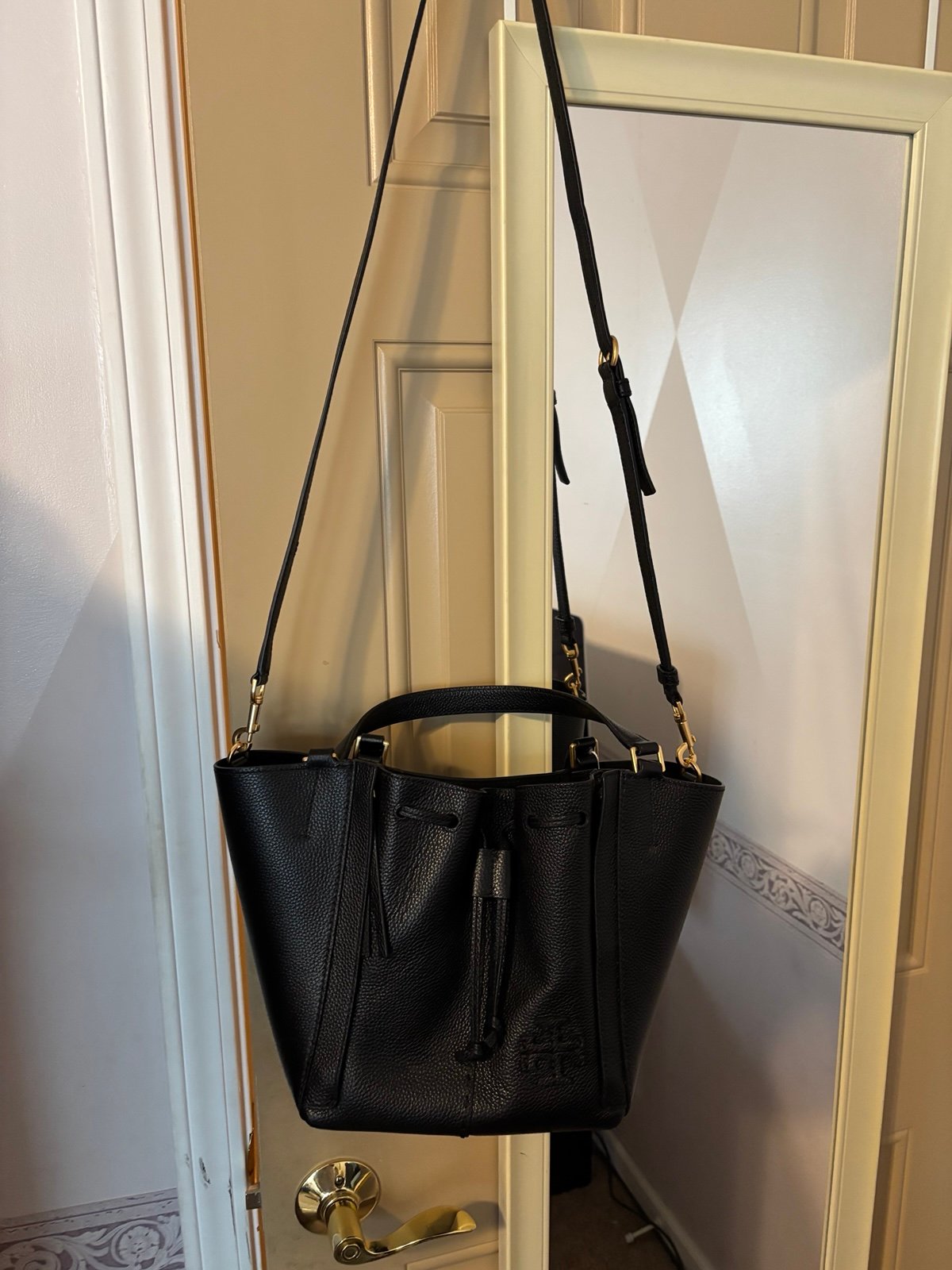 Brand new Tory Burch McGraw Dragonfly bucket bag. Black, pebbled leather with gold hardware.
